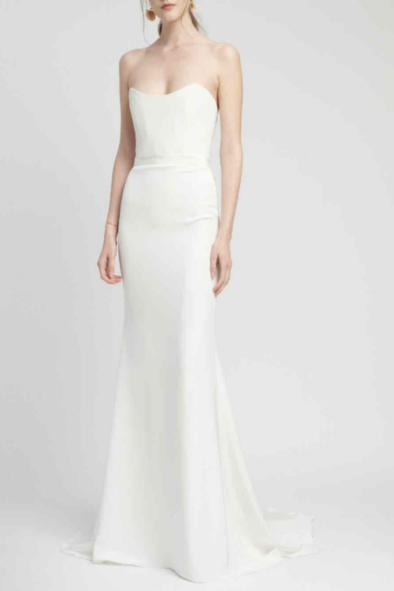 A classic strapless, with slight sweetheart bodice and low scoop back pair beautifully with the sleek, fitted lightweight silk skirt. The clean lines make this the perfect gown for any stylish, contemporary bride.