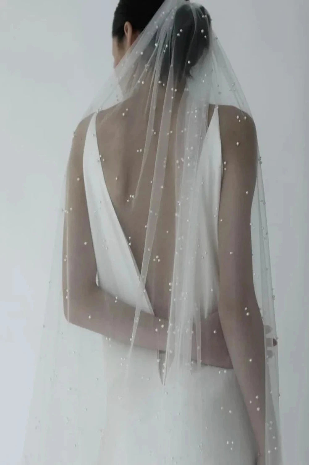 All over pearl detail on classic English tulle. Available in stock ready to ship.