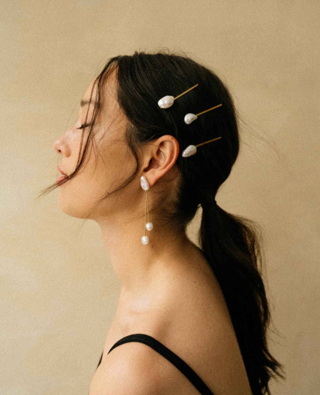 Hair accessories for the bride composed of 3 hair barrettes. Delicate and minimalist style, this set of barrettes is decorated with pretty different cultured pearls. Chic and simple wedding hair accessory for a timeless bride.